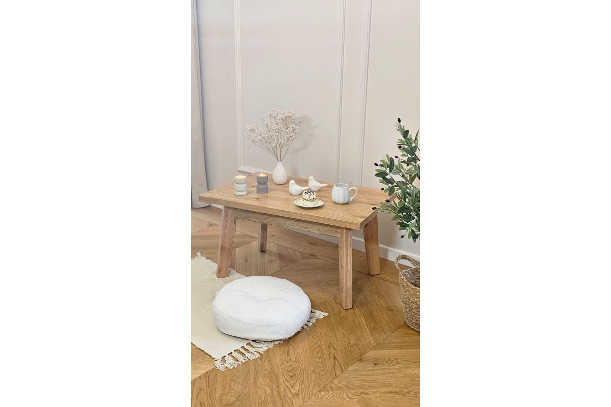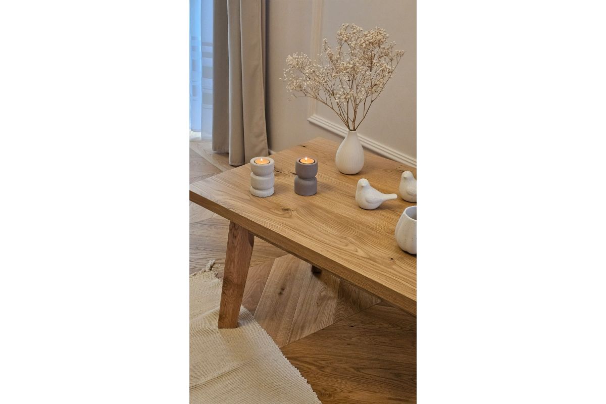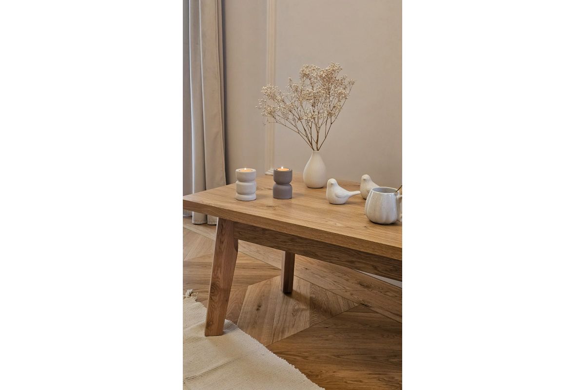Stolik kawowy „Rodos” — dębowy, sękaty, o naturalnym charakterze. Świetnie sprawdzi się jako centralny mebel w salonie, pokoju dziennym lub wypoczynkowym.